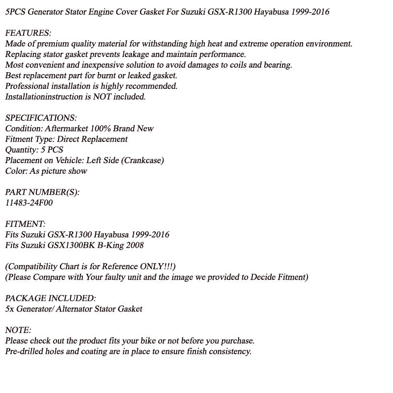 5 STÜCKE Generator Stator Motordeckeldichtung Für Suzuki GSX-R1300 Hayabusa 1999-2016