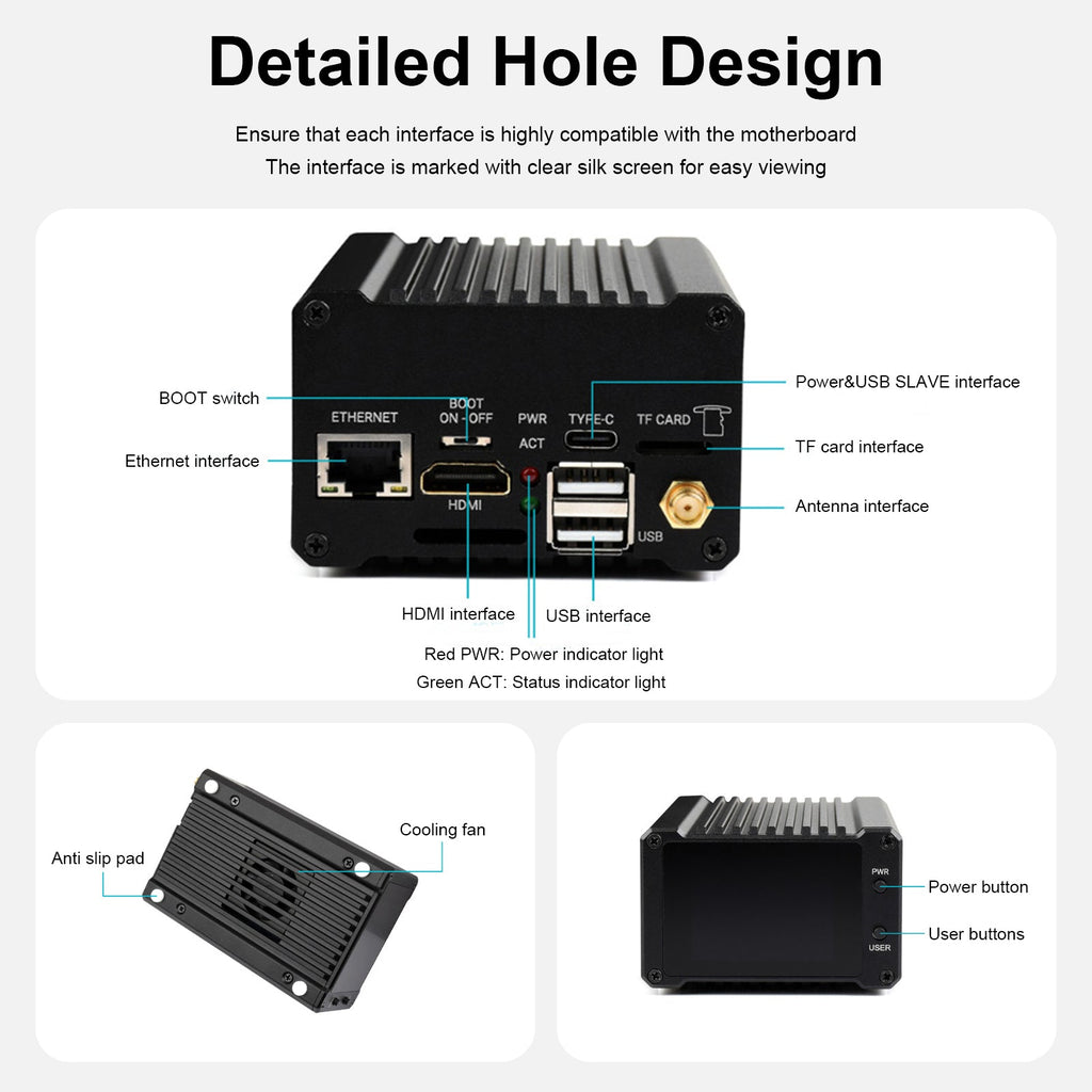 Eingebaute zwei SATA-Schnittstellen, über die 2,5-Zoll-Solid-State-Laufwerke installiert werden können. Ausgestattet mit einem 2-Zoll-SPI-LCD-Display zur einfachen Anzeige der CM4-Kerninformationen. Die Bedienung ist einfach und komfortabel und Dokumente, Videos und Musik können jederzeit online angesehen werden.