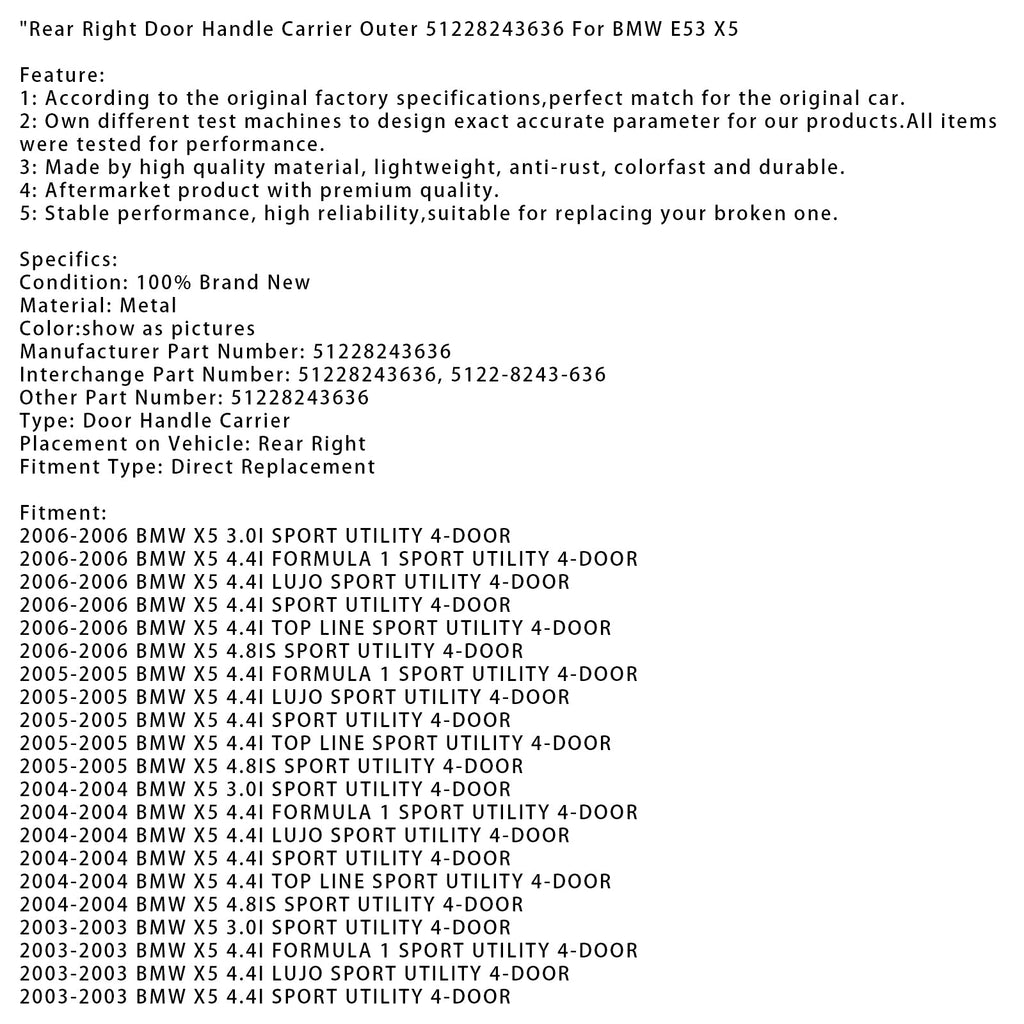 Hinten Rechts Türgriff Träger Äußere 51228243636 Für BMW E53 X5