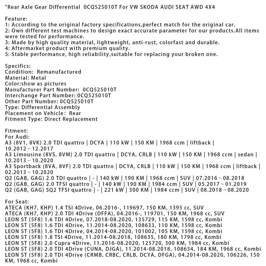 Hinterachse Getriebe Differential 0CQ525010T Für VW SKODA AUDI SEAT AWD 4X4