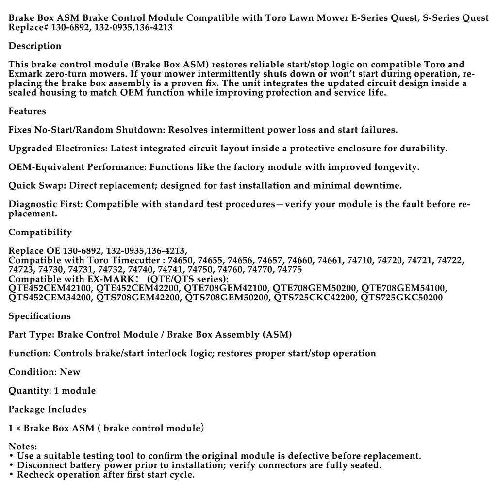 Brake Box ASM Bremssteuermodul Kompatibel mit Toro Rasenmäher E-Serie Quest, S-Serie Quest Ersetzt Nr. 130-6892, 132-0935,136-4213