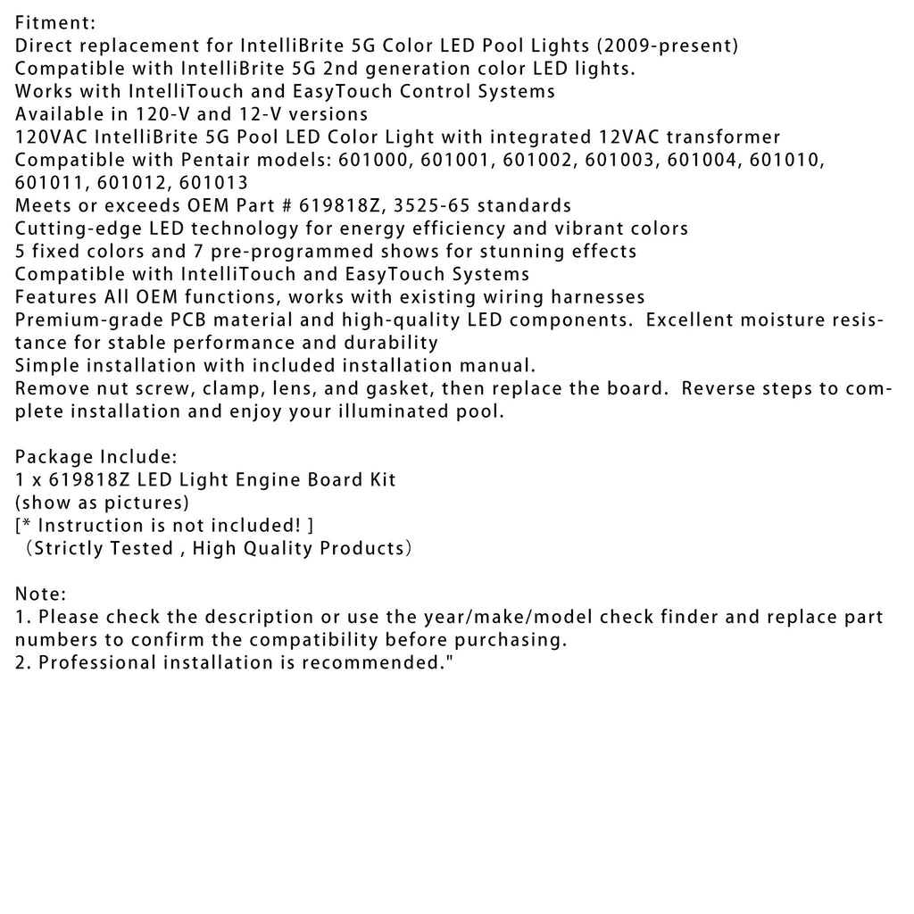 1. 【Excelente compatibilidade】Substituição para luzes de piscina LED coloridas IntelliBrite 5G de 2009 em diante. Compatível com luzes LED coloridas IntelliBrite 5G de 2ª geração. Compatível com as seguintes luzes LED para piscina e spa Pentiar: 601000, 601001, 601002, 601003, 601004, 601010, 601011, 601012, 601013. Projetado e testado profissionalmente para atender ou exceder o número de peça OEM 619818Z, 3525-65.