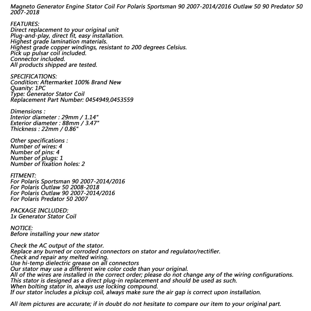 Bobina do estator do motor do gerador magneto para Polaris Sportsman 90 2007-2014/2016 Outlaw 50 90 Predator 50 2007-2018