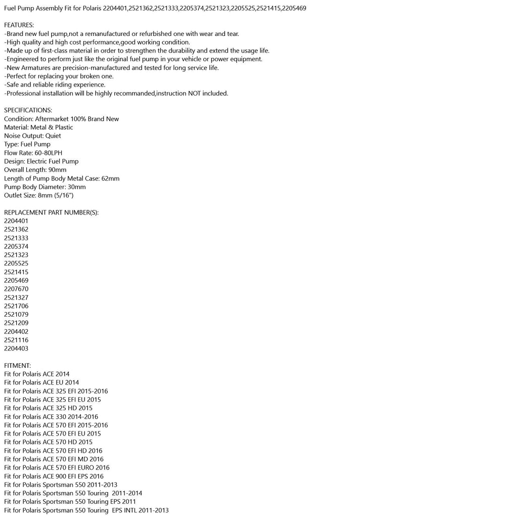Conjunto da bomba de combustível se encaixa no Polaris 2204401, 2521362, 2521333, 2205374, 2521323, 2205525, 2521415, 2205469