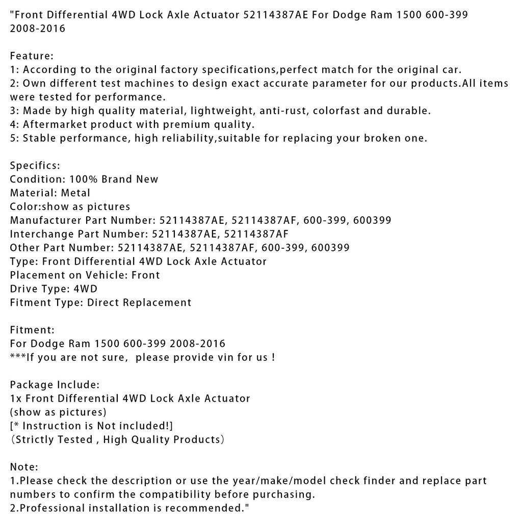 Vorderachs-Differentialsperre 4WD Achsaktuator 52114387AE Passend für Dodge Ram 1500 600-399 2008-2016