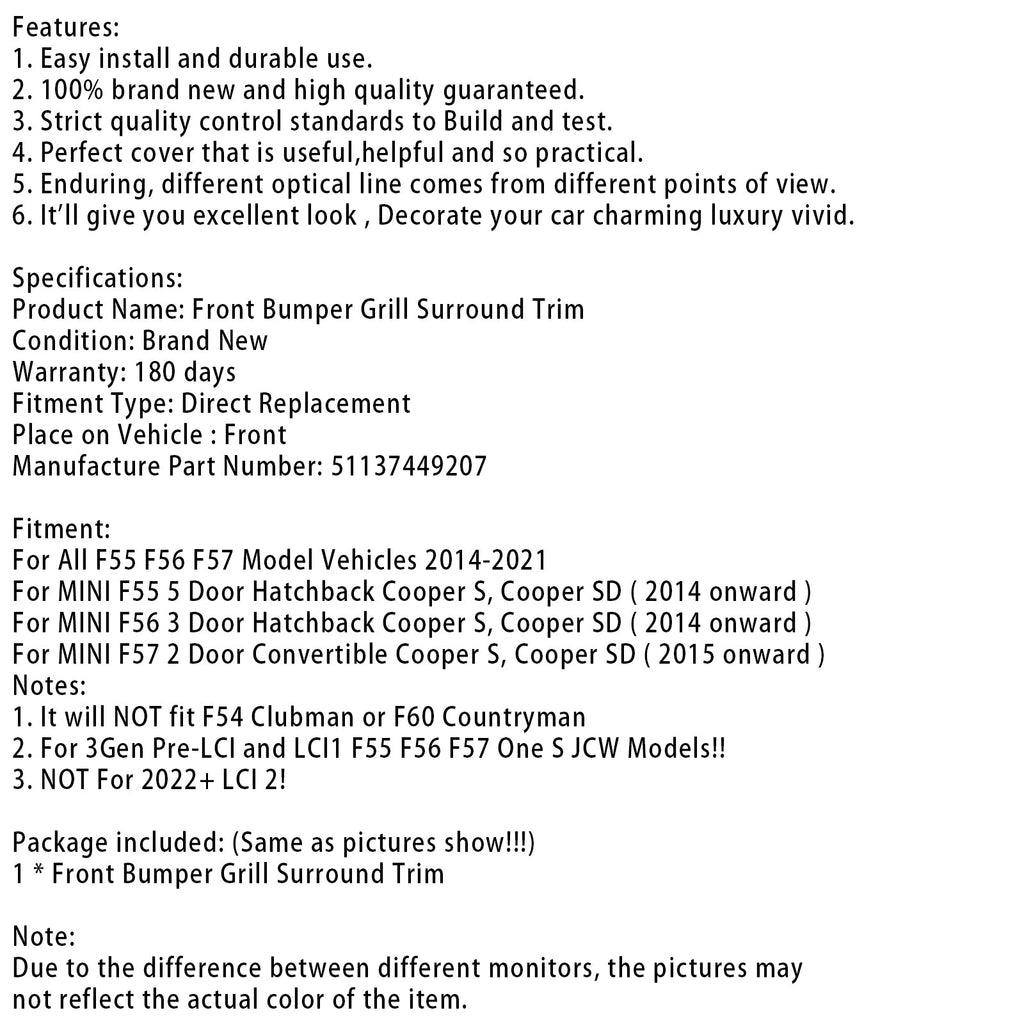 Surround da grade do radiador se encaixa Mini Cooper F55 F56 F57 2014-2021 51137449207