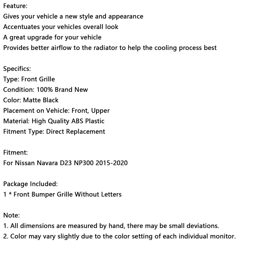 Grade do pára-choque dianteiro preto fosco adequada para Nissan Navara NP300 D23 2015-2020