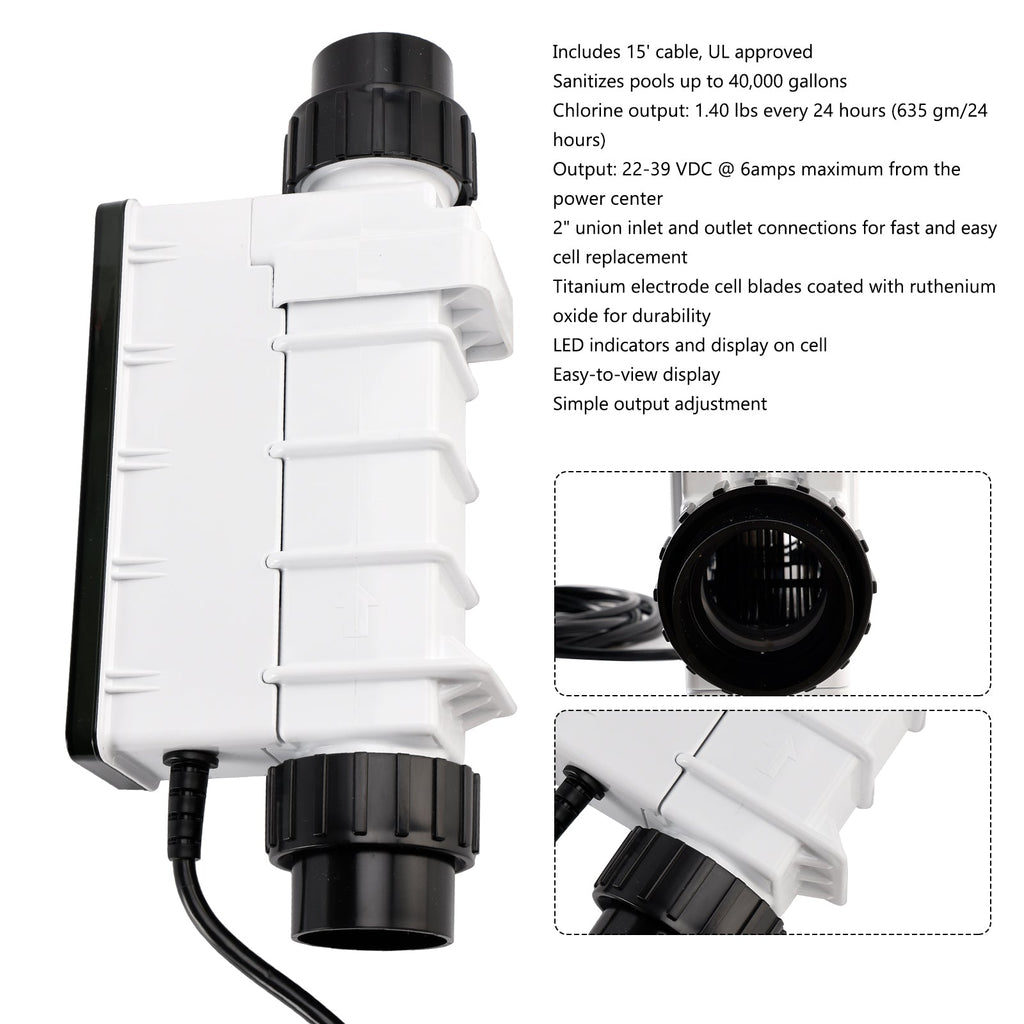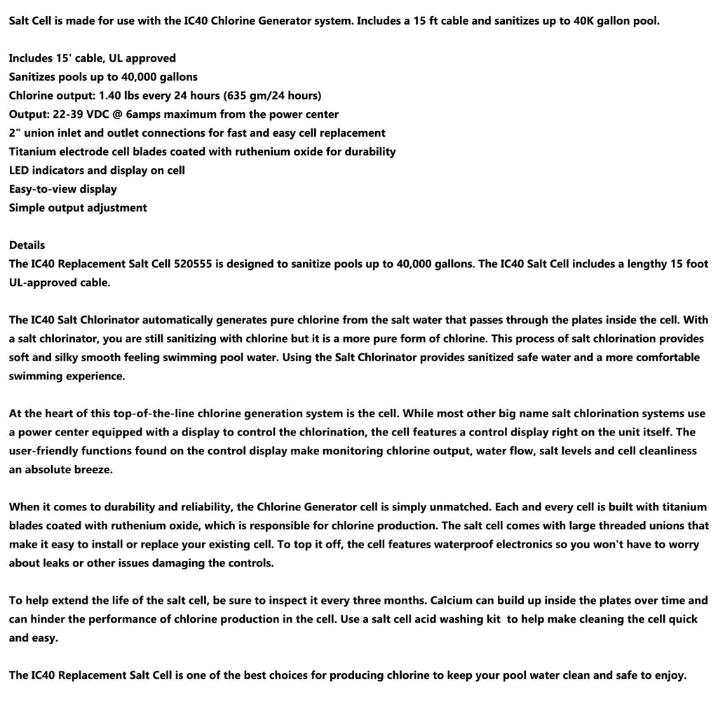 Die IC40 Ersatz-Salzzelle 520555 ist für die Desinfektion von Pools mit bis zu 40.000 Gallonen konzipiert. Die IC40 Salzzelle verfügt über ein 15 Fuß langes, UL-zugelassenes Kabel.
