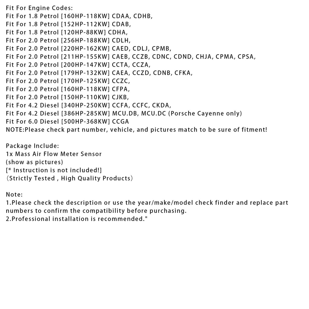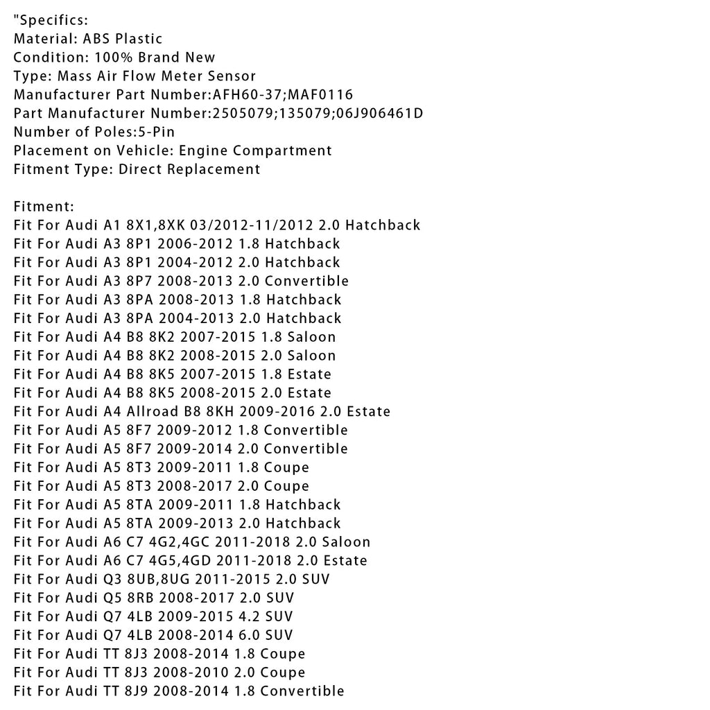 Mass Air Flow Meter Sensor For Audi A3 8P1 A4 B8 Q5 8RB TT 8J3 A6 C7 2505079