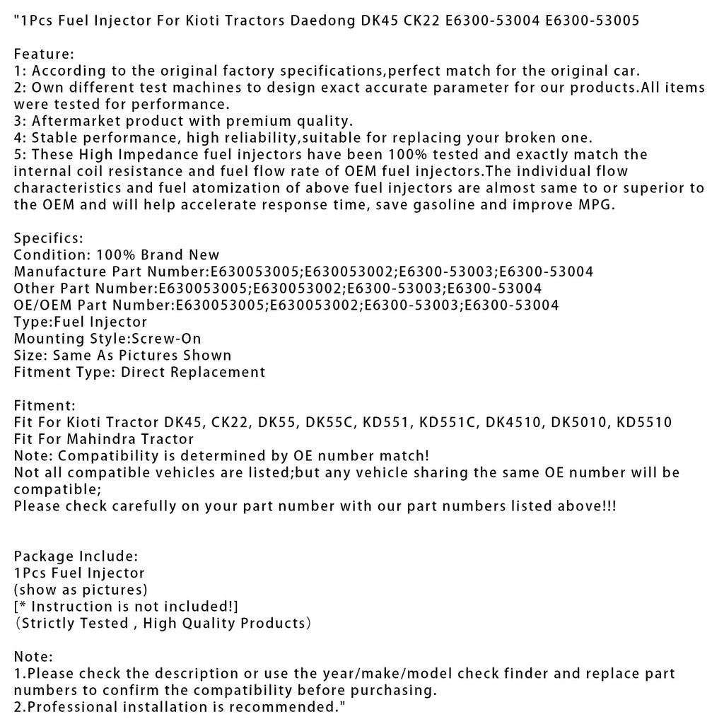 1 Stück Kraftstoffeinspritzdüse für Kioti Traktoren Daedong DK45 CK22 E6300-53004 E6300-53005