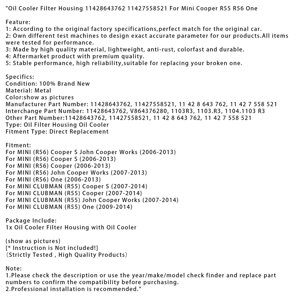 Ölkühler Filter Gehäuse 11428643762 11427558521 Für Mini Cooper R55 R56 Eine