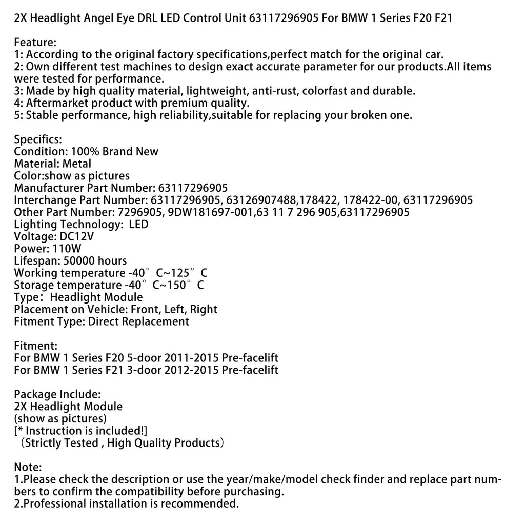2X Headlight Angel Eye DRL LED Control Unit 63117296905 For BMW 1 Series F20 F21