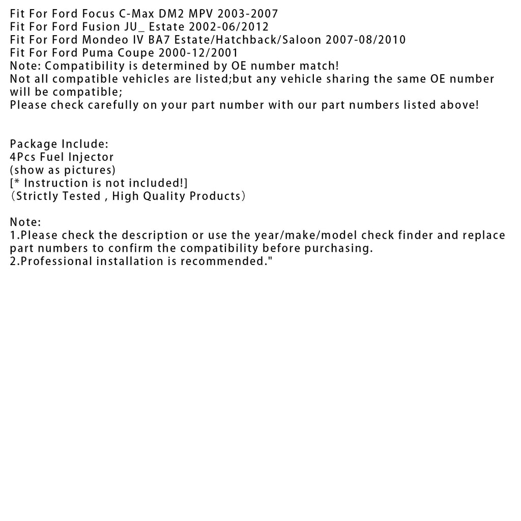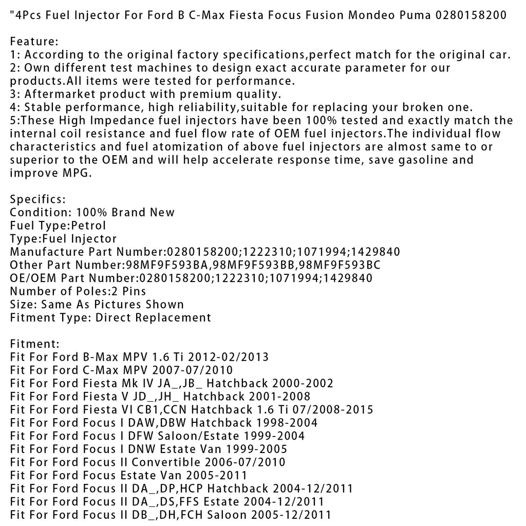 4 Stück Kraftstoffeinspritzdüsen für Ford B C-Max Fiesta Focus Fusion Mondeo Puma 0280158200