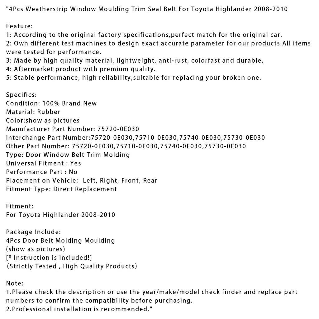 4Pcs Weatherstrip Fenster Moulding Trim Dichtung Gürtel Für Toyota Highlander 2008-2010