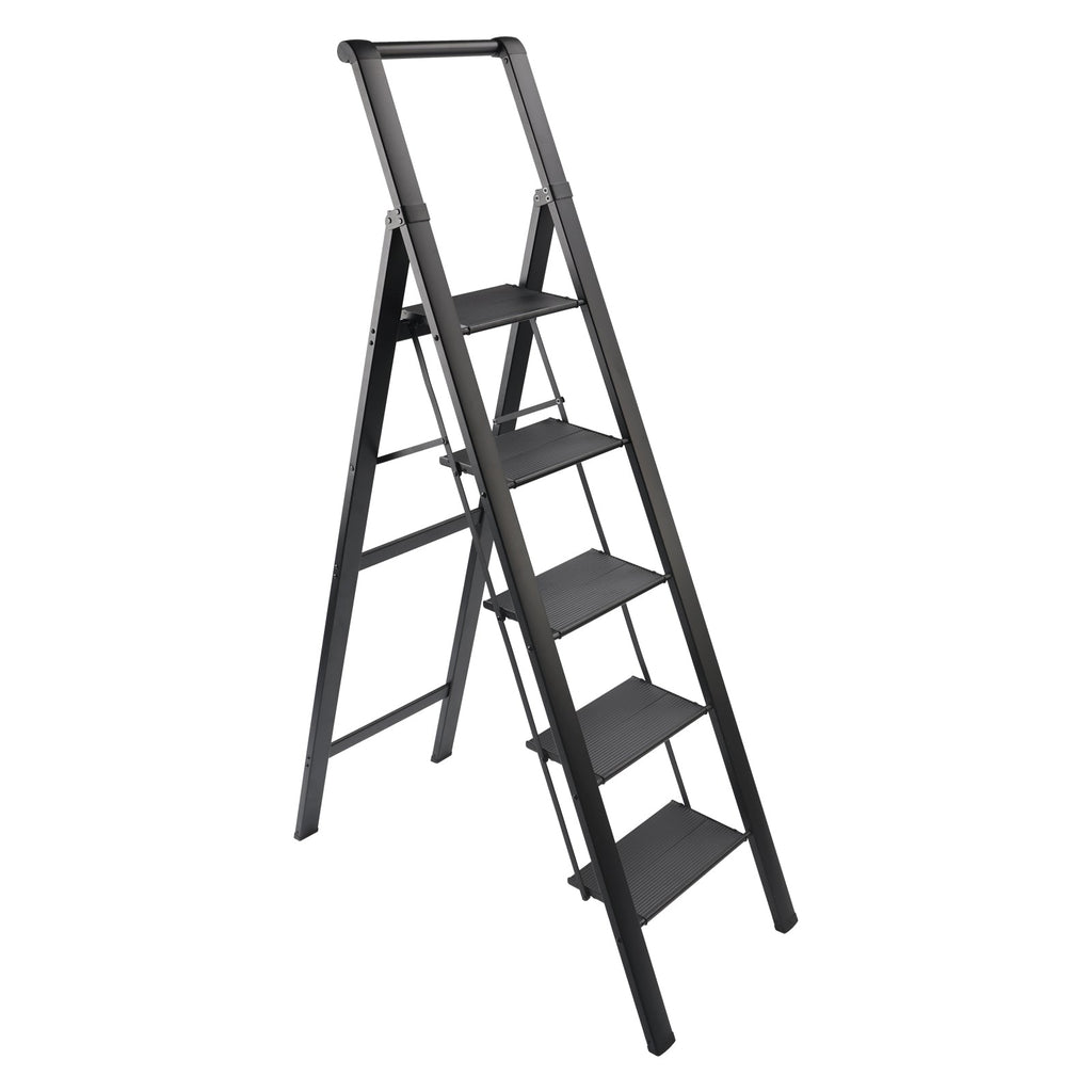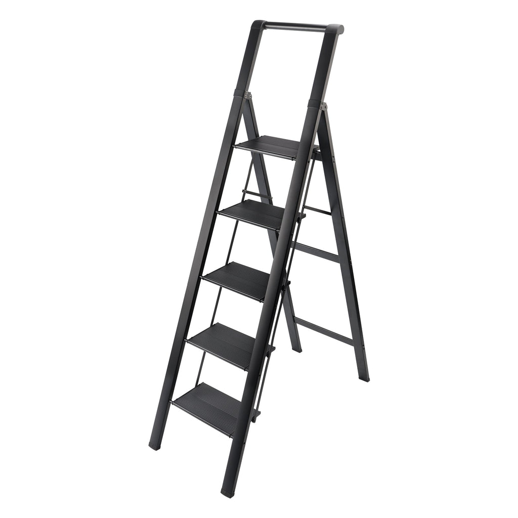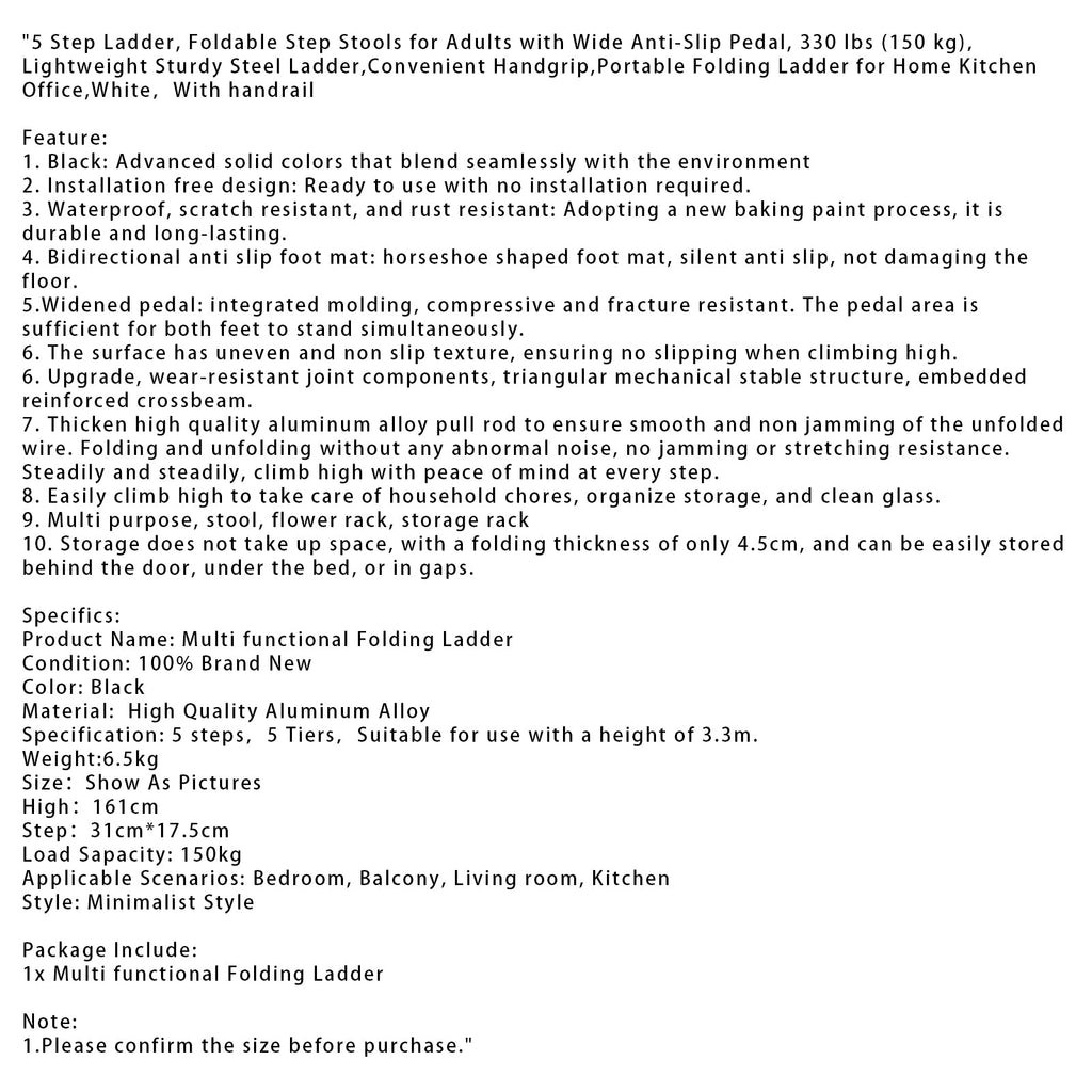 5-stegsstege, hopfällbar pall för vuxna med bred halkfri pedal, 150 kg (330 lbs), lätt, robust stålstege, bekvämt handtag, bärbar hopfällbar stege för hem, kök, kontor, vit, med ledstång