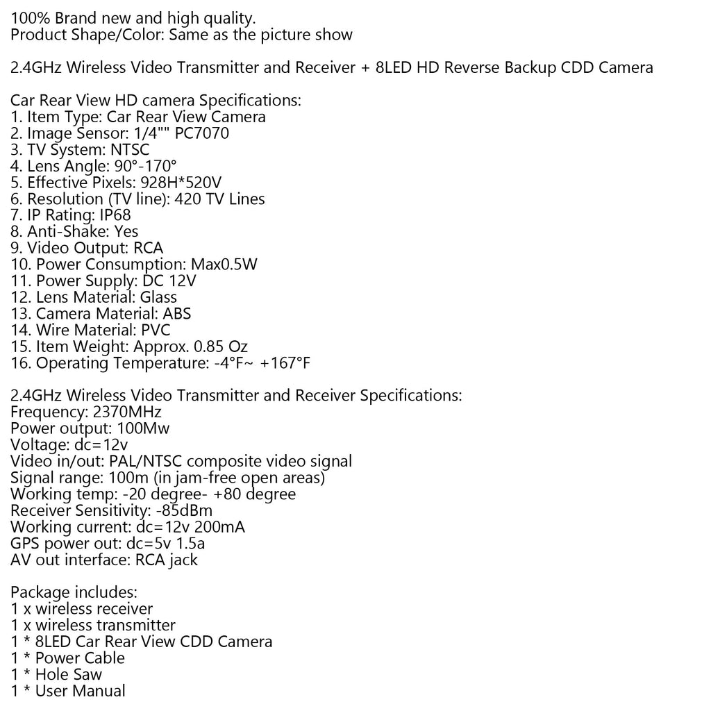 Trådlös RCA-videomottagare/sändare; Undvik komplicerade ledningar, för användning med in-car monitor, backup system. Endast när du drar bakåt kommer monitorn automatiskt att visa en säkerhetskopia. Du kan ansluta alla delar till en konstant strömförsörjning eller ett 12V batteri, monitorn visar bilden konstant.
