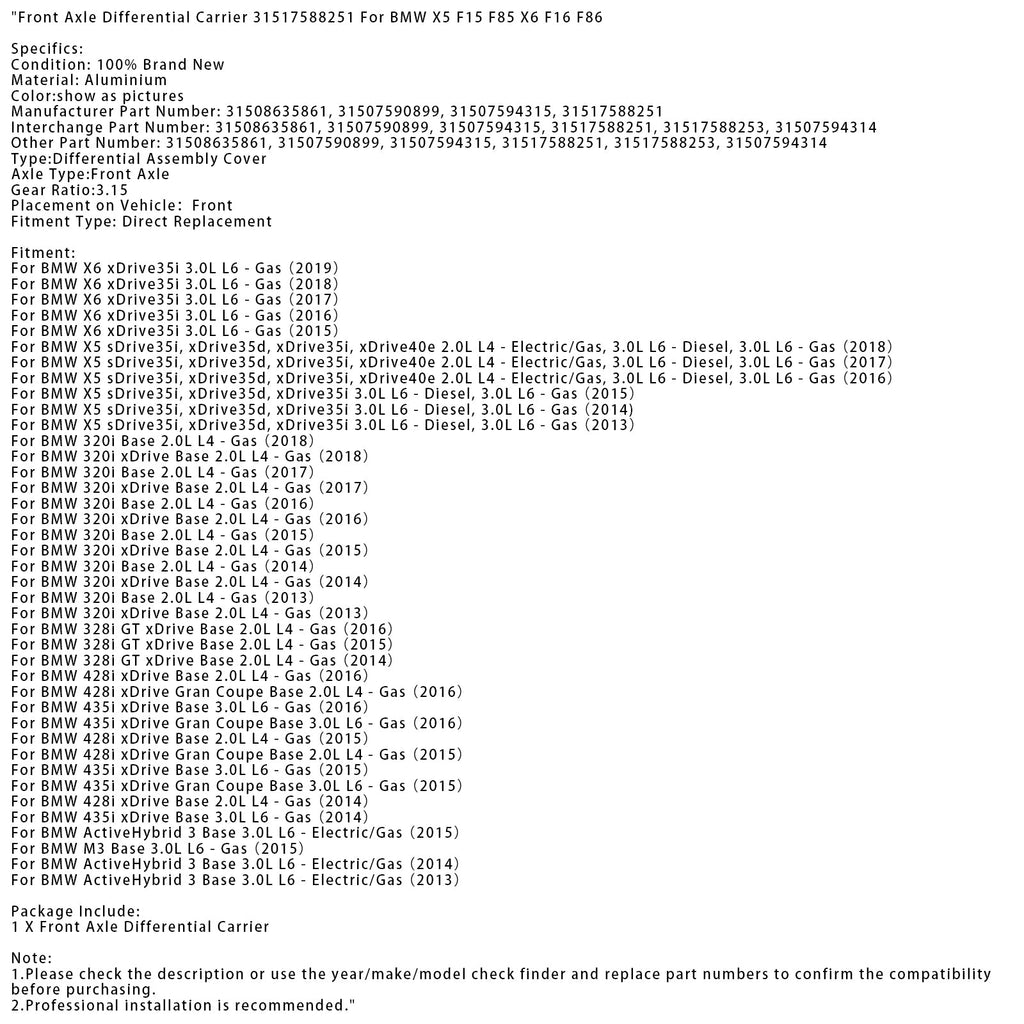 Framaxel Differentialbärare 31517588251 för BMW X5 F15 F85 X6 F16 F86