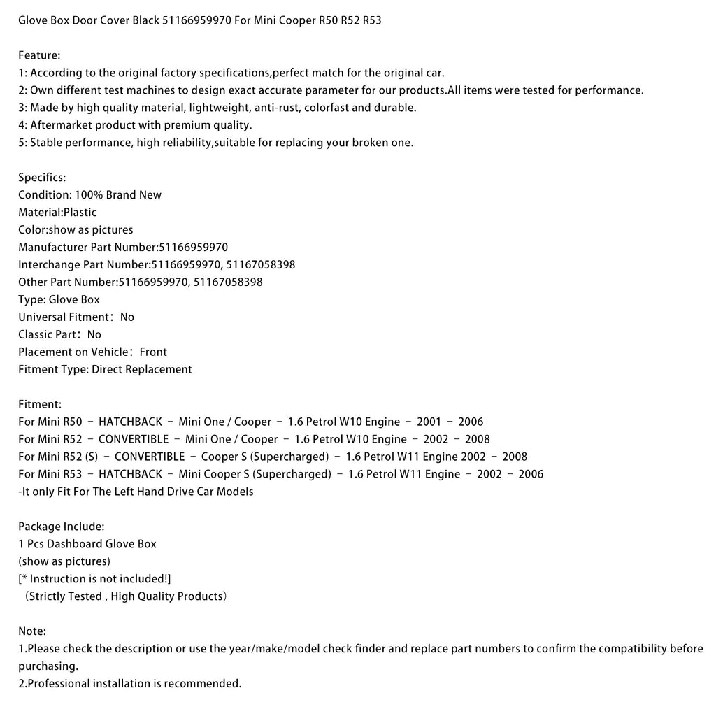Handschuhfachabdeckung Schwarz 51166959970 Passend für Mini Cooper R50 R52 R53