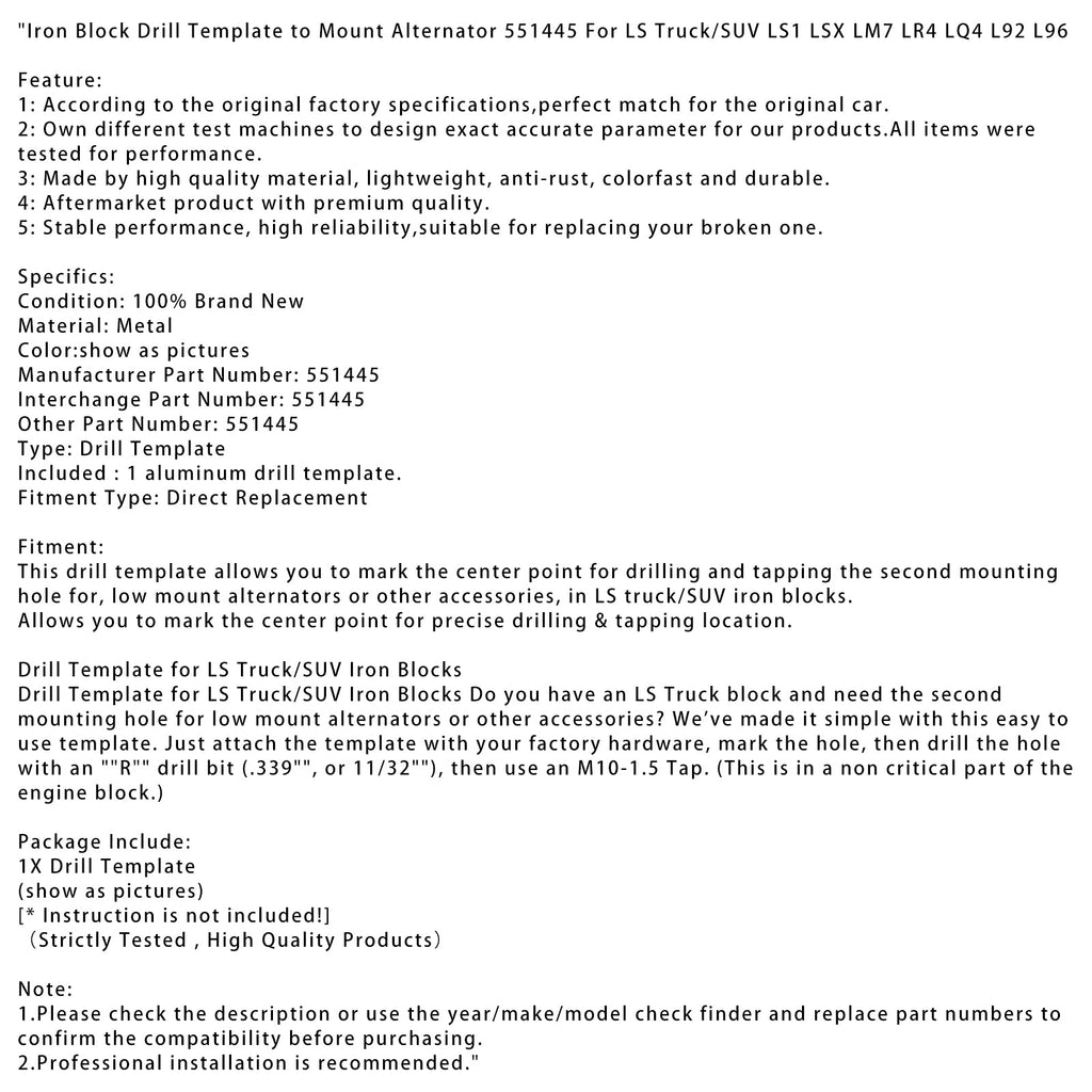 Denna borrmall låter dig markera mittpunkten för att borra och gänga det andra monteringshålet för lågmonterade generatorer eller andra tillbehör i järnblocken på LS-lastbilar/SUV:ar.