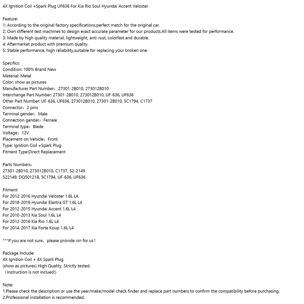 4x tändspole + tändstift UF636 lämplig för Kia Rio Soul Hyundai Accent Veloster