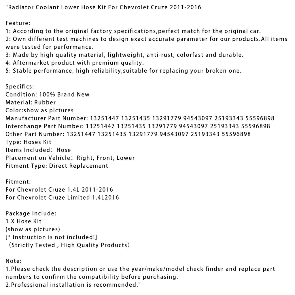 Kylvätskeslangsats, nedre slangsats för Chevrolet Cruze 2011-2016