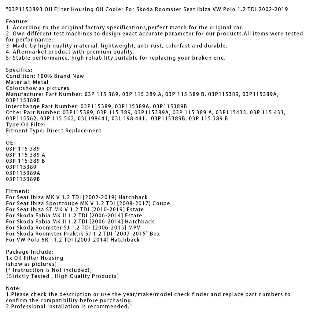03P115389B Ölfiltergehäuse/Ölkühler für Skoda Roomster, Seat Ibiza, VW Polo 1.2 TDI 2002-2019