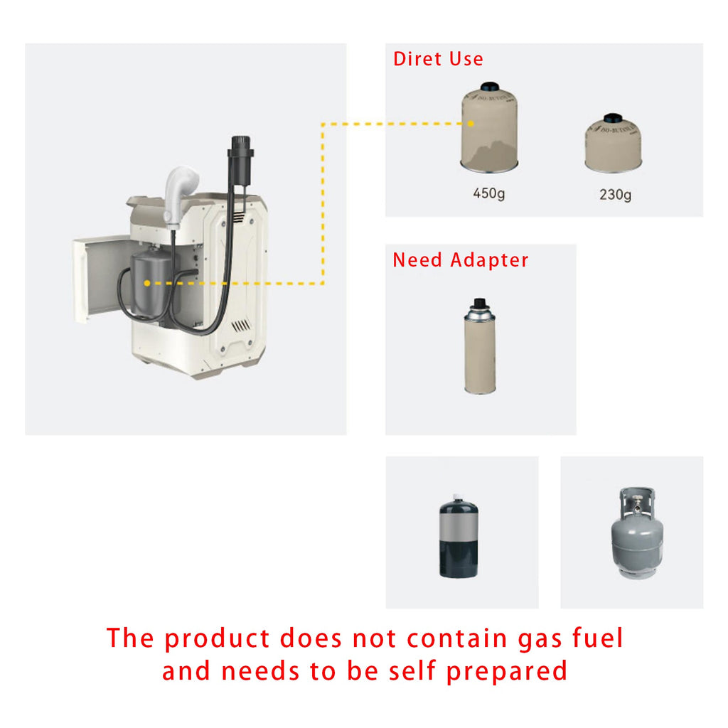 Gaskompatibilität: Schraubgasflaschen (EN 417) oder wiederbefüllbare Propangasflaschen, die einen geeigneten Adapter erfordern.