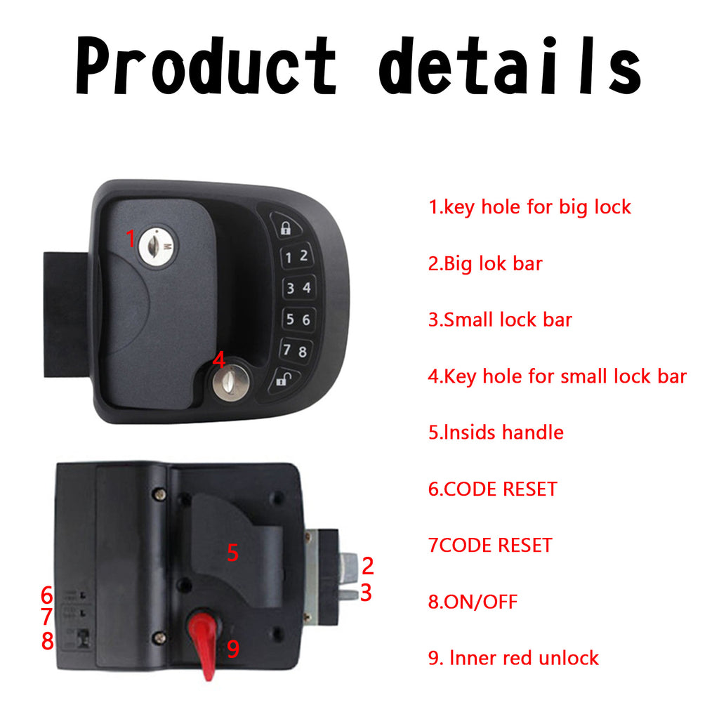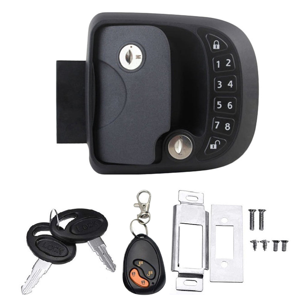 1 x RV-dörrlås (AA-batteri ingår INTE) 1 x beslag i rostfritt stål 1 x fjärrkontroll (batteri ingår) 2 x nycklar Garanti: