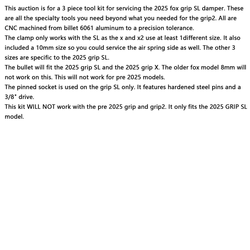 Denna auktion inkluderar ett 3-delat verktygssats för service av Fox Grip SL-dämparen (2025). Det här är alla specialverktyg du behöver utöver verktygen till Grip2. Alla verktyg är CNC-frästa av billetaluminium 6061 med högsta precisionstolerans.