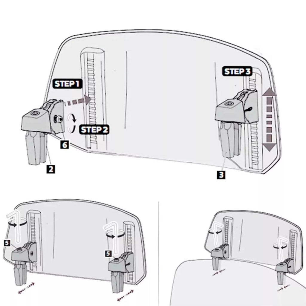 1: Justerbar vindruta, fäst ovanpå originalvindrutan och upphöjd för att förbättra säkerheten för förarens huvudskydd.