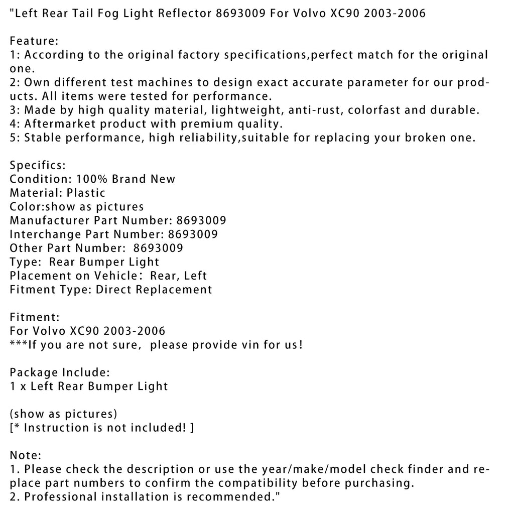Vänster bak dimljusreflektor 8693009 Passar för Volvo XC90 2003-2006