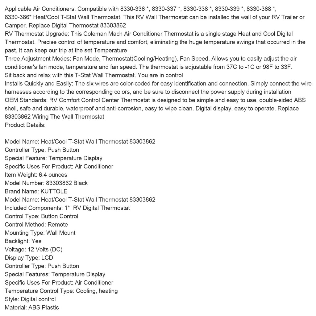 Tillämpliga luftkonditioneringsapparater: Kompatibel med 8330-336*, 8330-337*, 8330-338*, 8330-339*, 8330-368*, 8330-386* Värme/Kylning T-Stat väggtermostat. Denna husbilsväggstermostat kan installeras på väggen på din husbilsvagn eller husbil. Ersätter den digitala termostaten 83303862