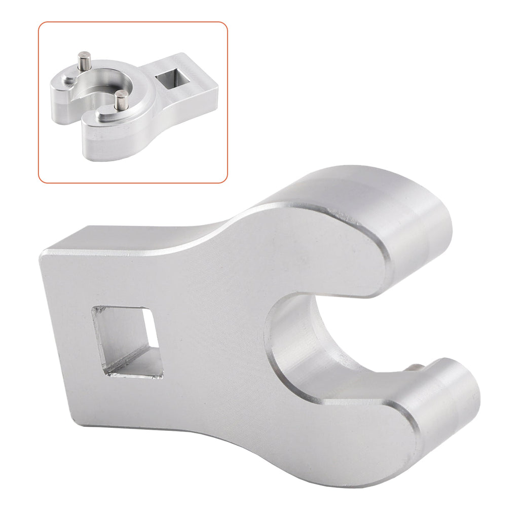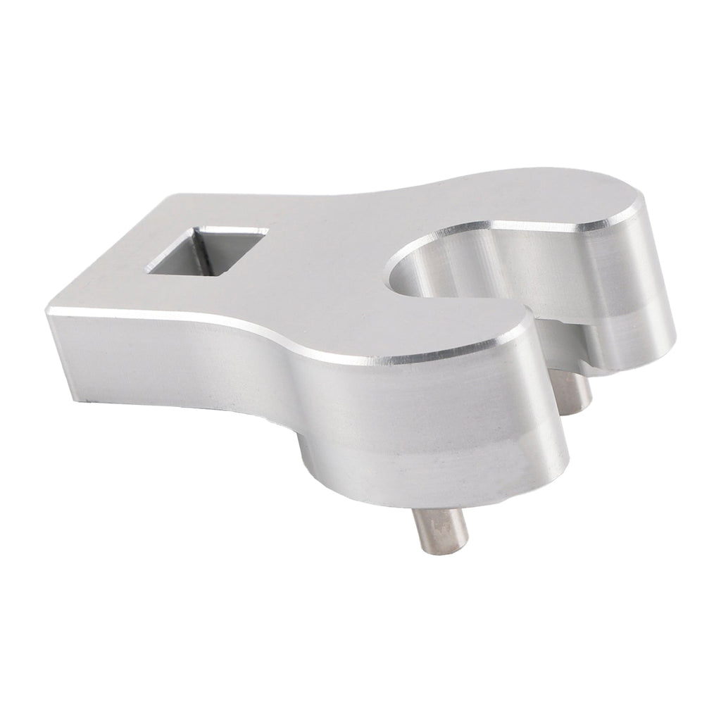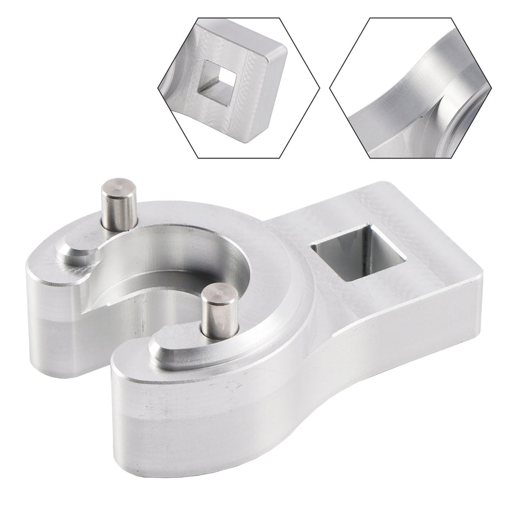 Verktyget har en rå borstad yta med fasade kanter. Den har härdade stålstift och är maskinbearbetad från billet 6061 T6 aluminium med hjälp av en CNC-maskin. Den använder en 3/8-tums fyrkantsfäste. Vid åtdragning, tryck vinkelrätt mot verktyget (90 grader) för att uppnå det mest exakta resultatet.