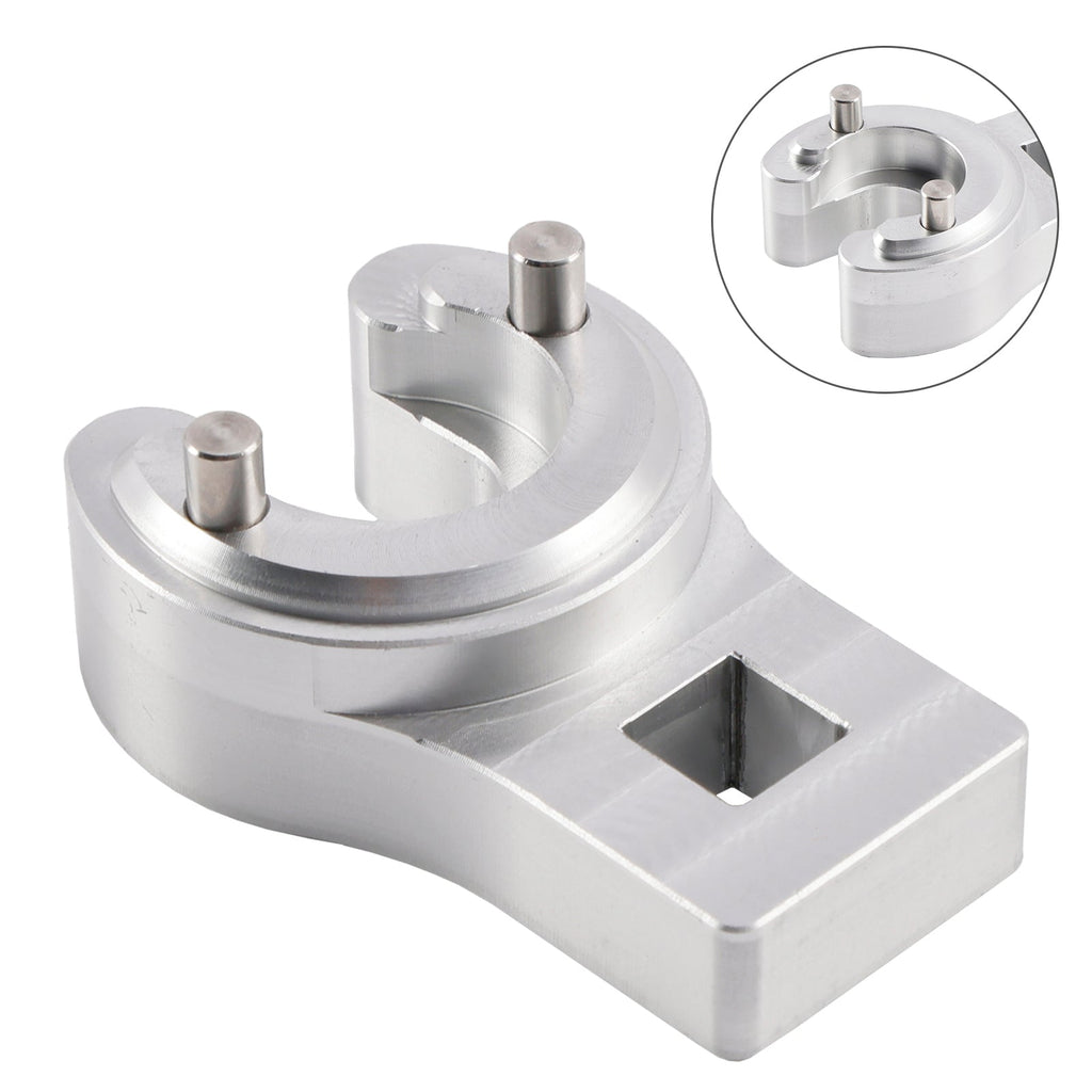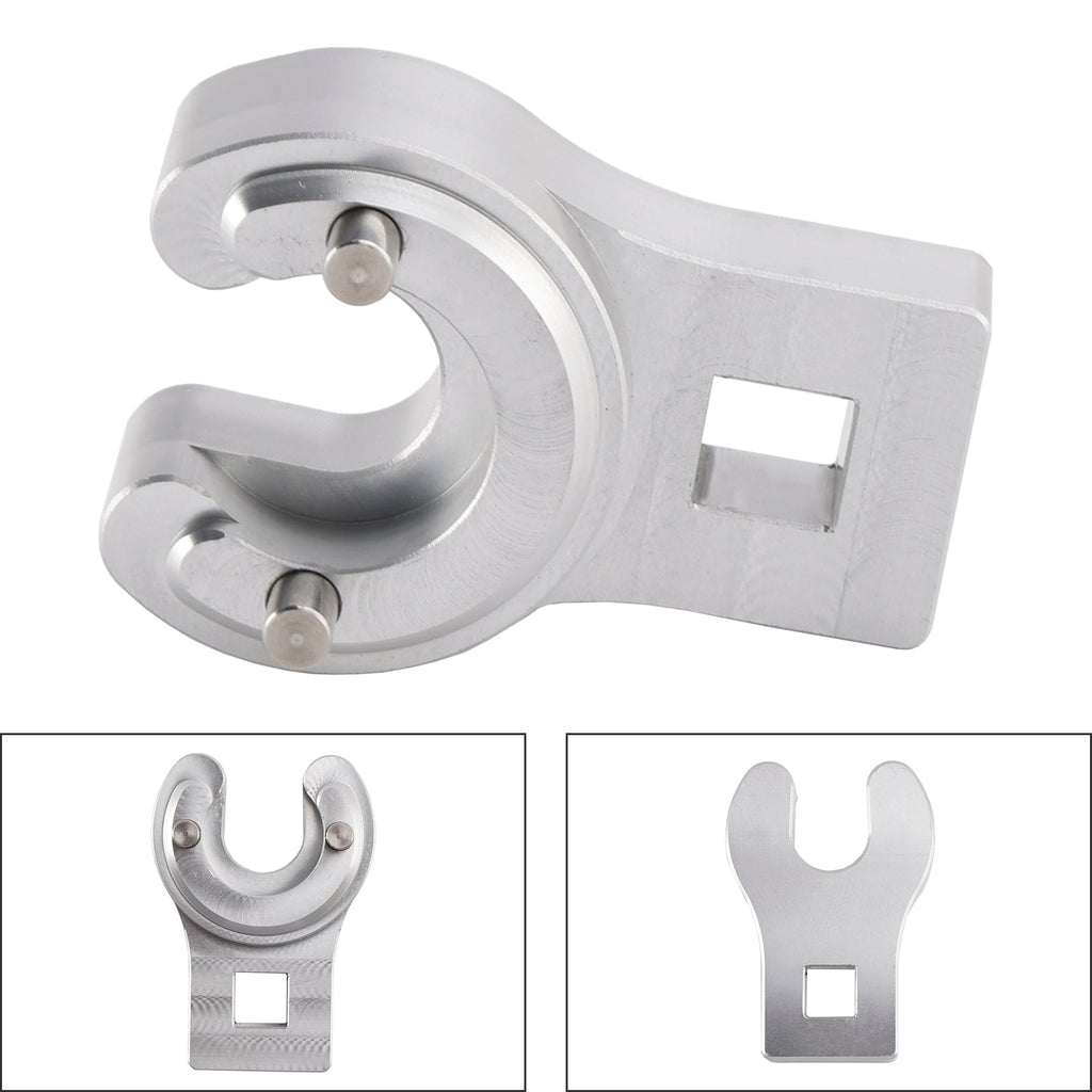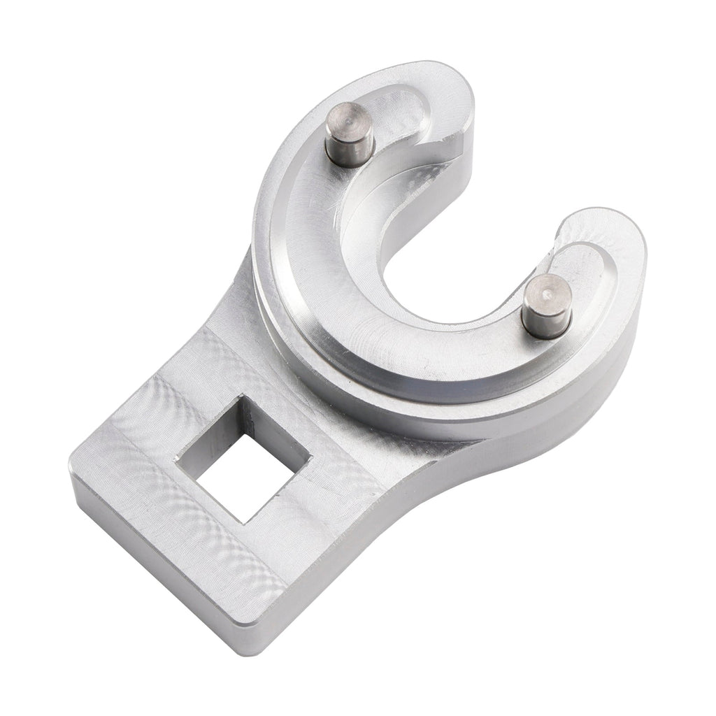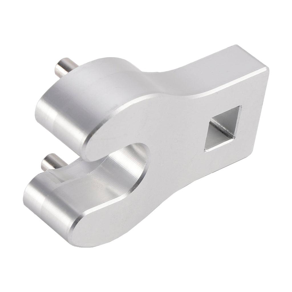 Verktyget har en rå borstad yta med fasade kanter. Den har härdade stålstift och är maskinbearbetad från billet 6061 T6 aluminium med hjälp av en CNC-maskin. Den använder en 3/8-tums fyrkantsfäste. Vid åtdragning, tryck vinkelrätt mot verktyget (90 grader) för att uppnå det mest exakta resultatet.